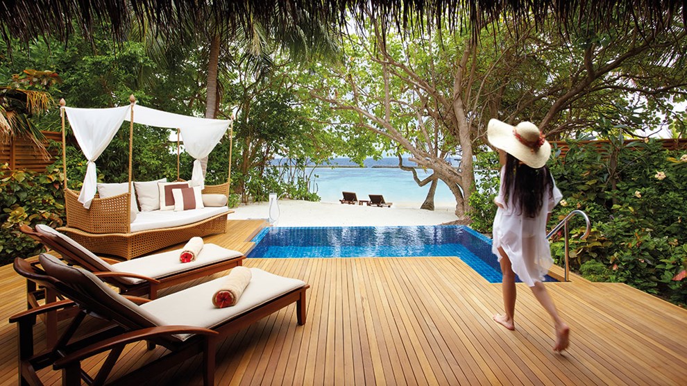 One of the most captivating resorts in the Maldives, rich tropical gardens, interspersed with coconut trees and sandy walkways, are complemented by stunning beaches and tranquil seas. This is a place that simply oozes romance.